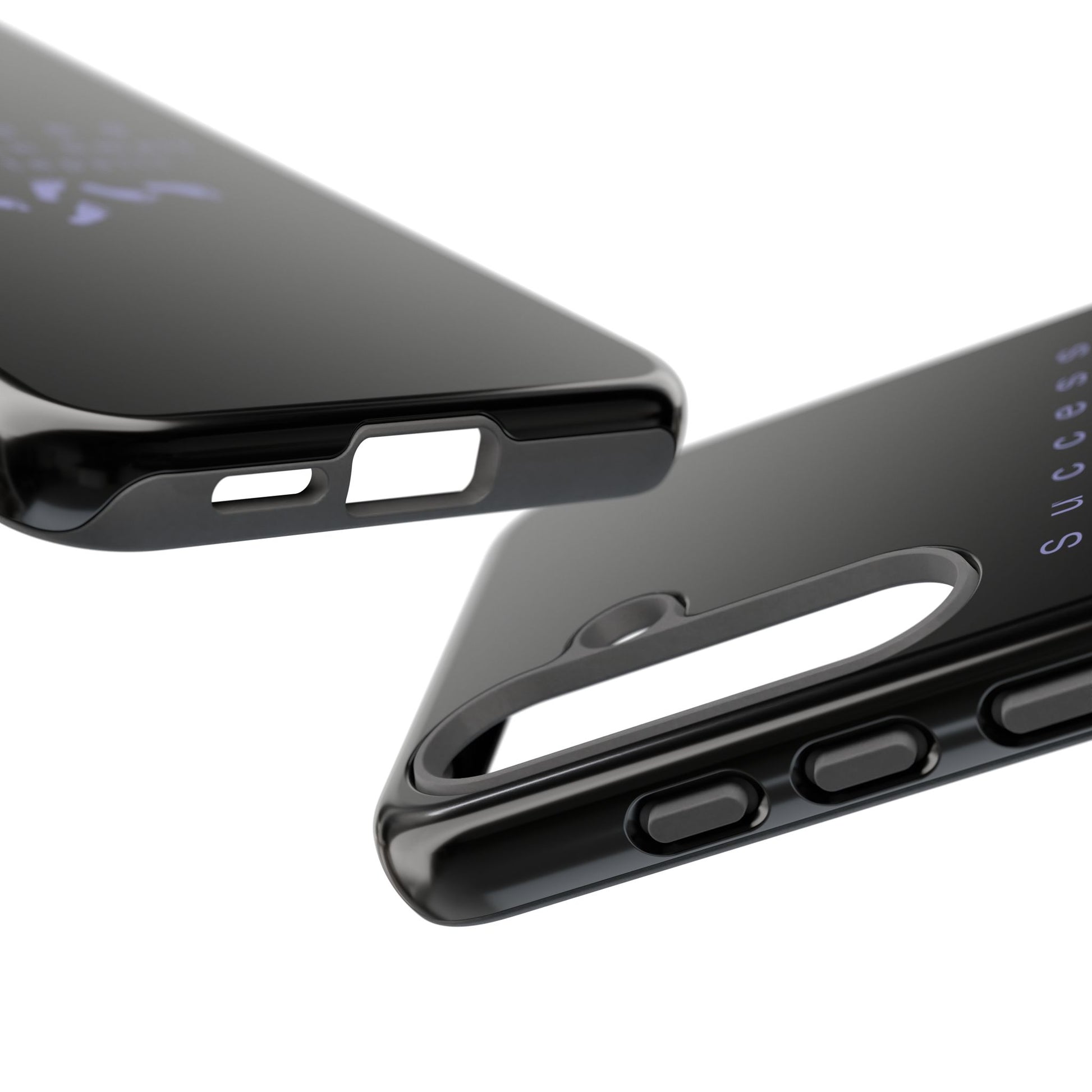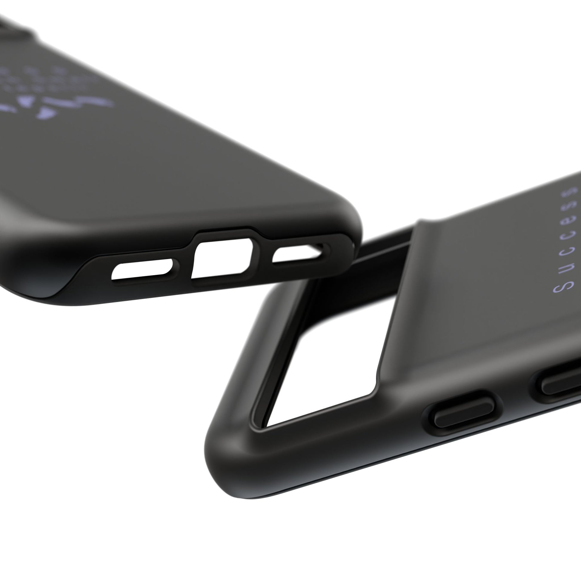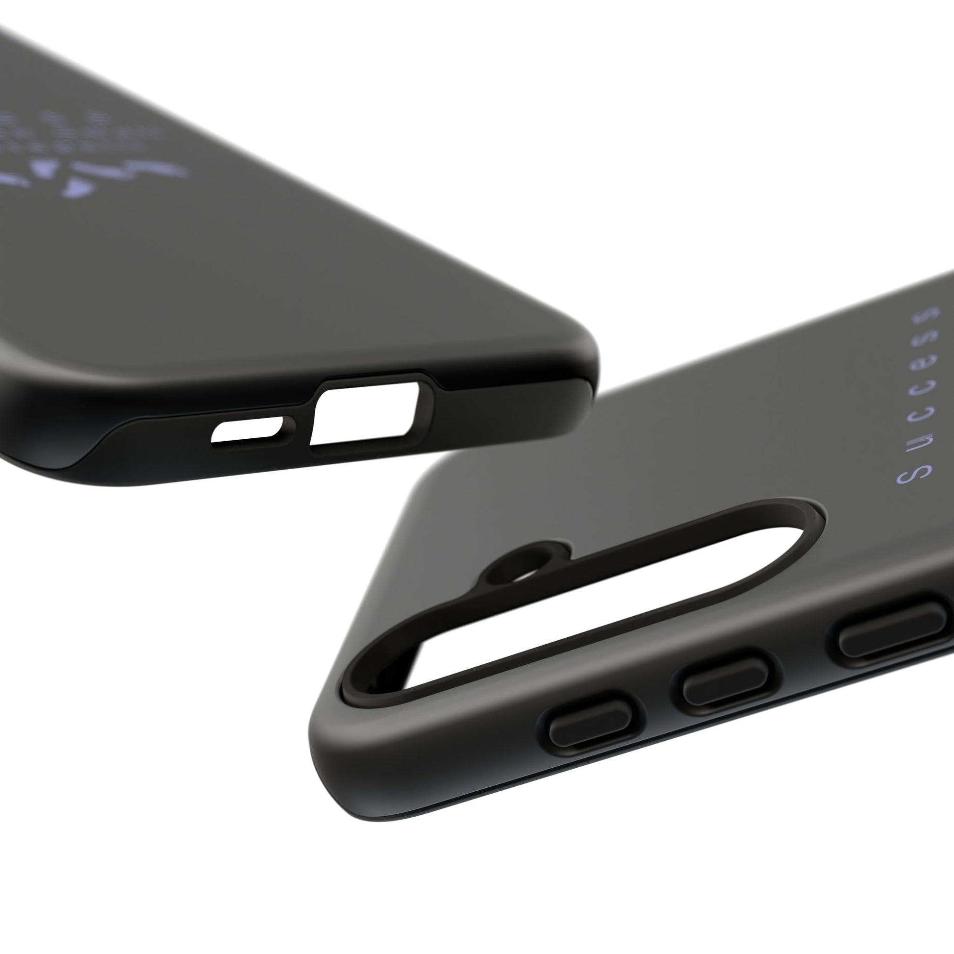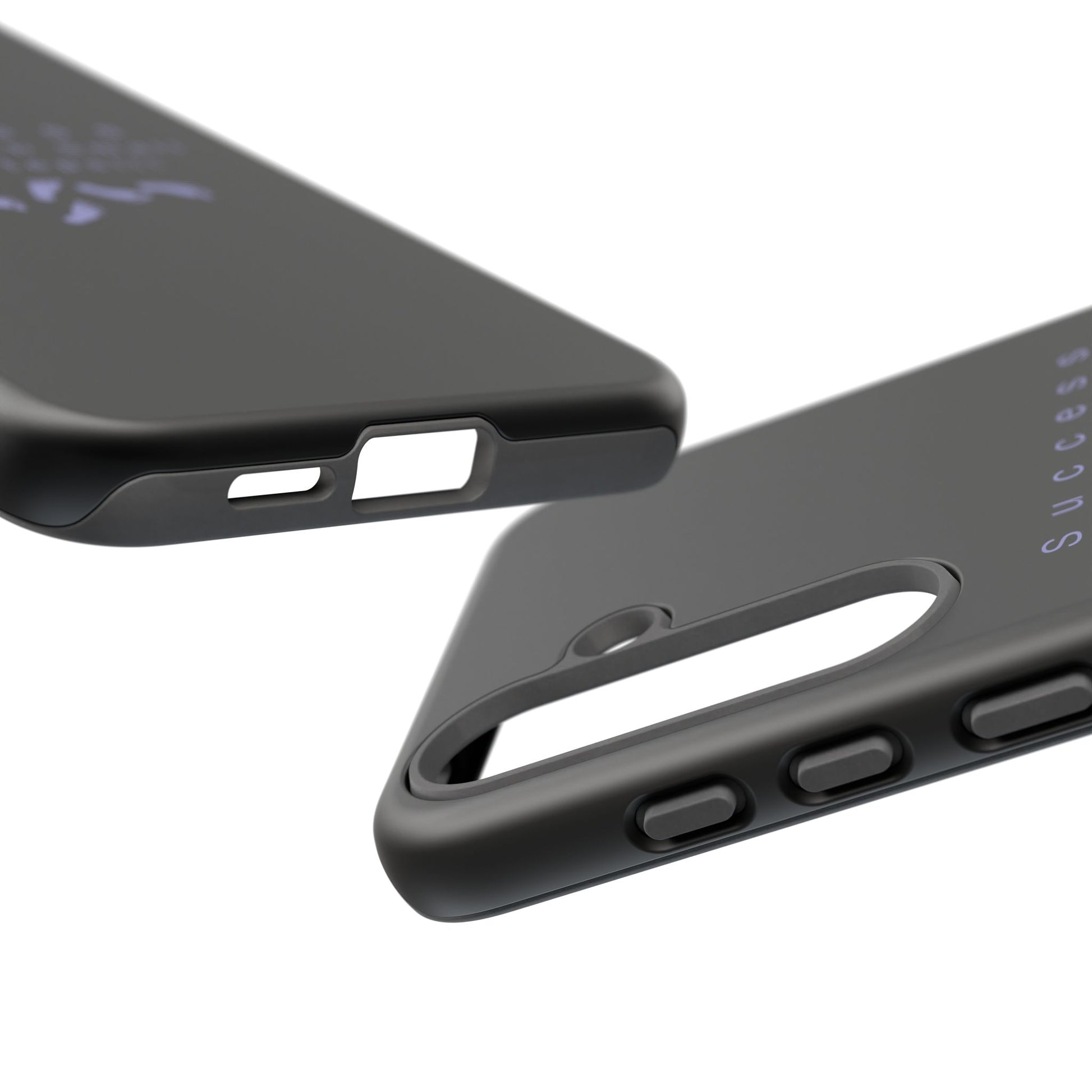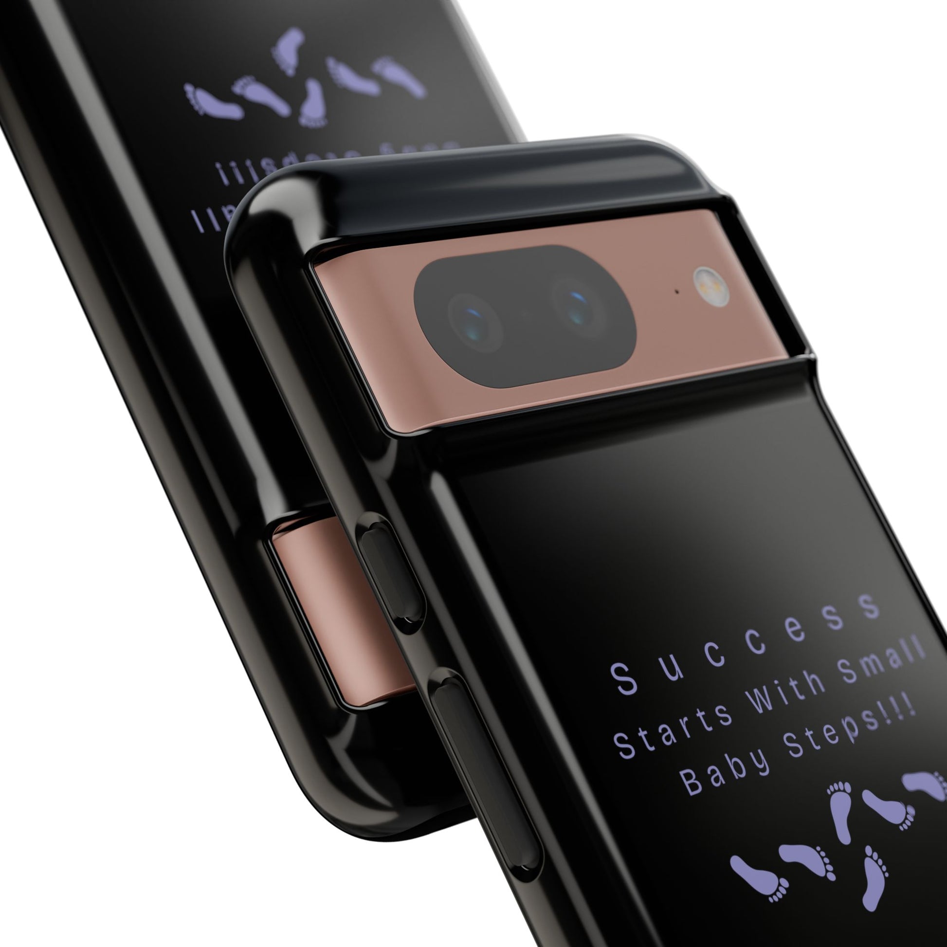 A slim, dual-layer protective phone case with a quiet, motivational design: pale lilac text reading “Success Starts With Small Baby Steps!!!” above a trail of tiny shoe prints on a deep matte black background. The case feels sturdy in hand thanks to a TPU silicone liner that cushions drops, while the hard polycarbonate shell resists impacts and maintains the printed artwork with full 3D wrap transfer. It slips into pockets without bulk and keeps ports clear for charging and headphones, while still supporting standard wireless charging. Lightweight, rugged, and understated — this case is for someone who moves forward deliberately and wants their everyday gear to reflect that steady mindset.