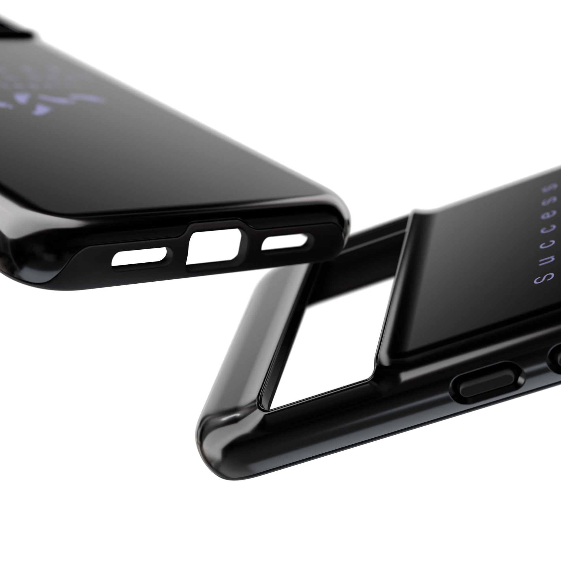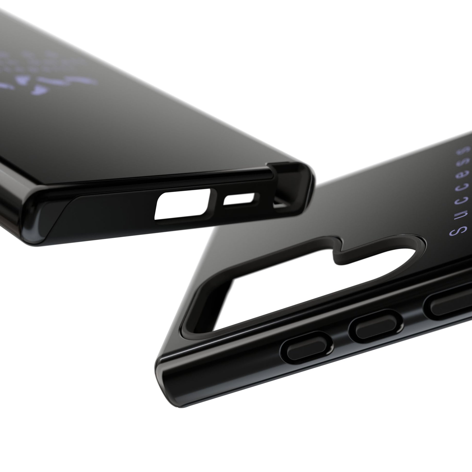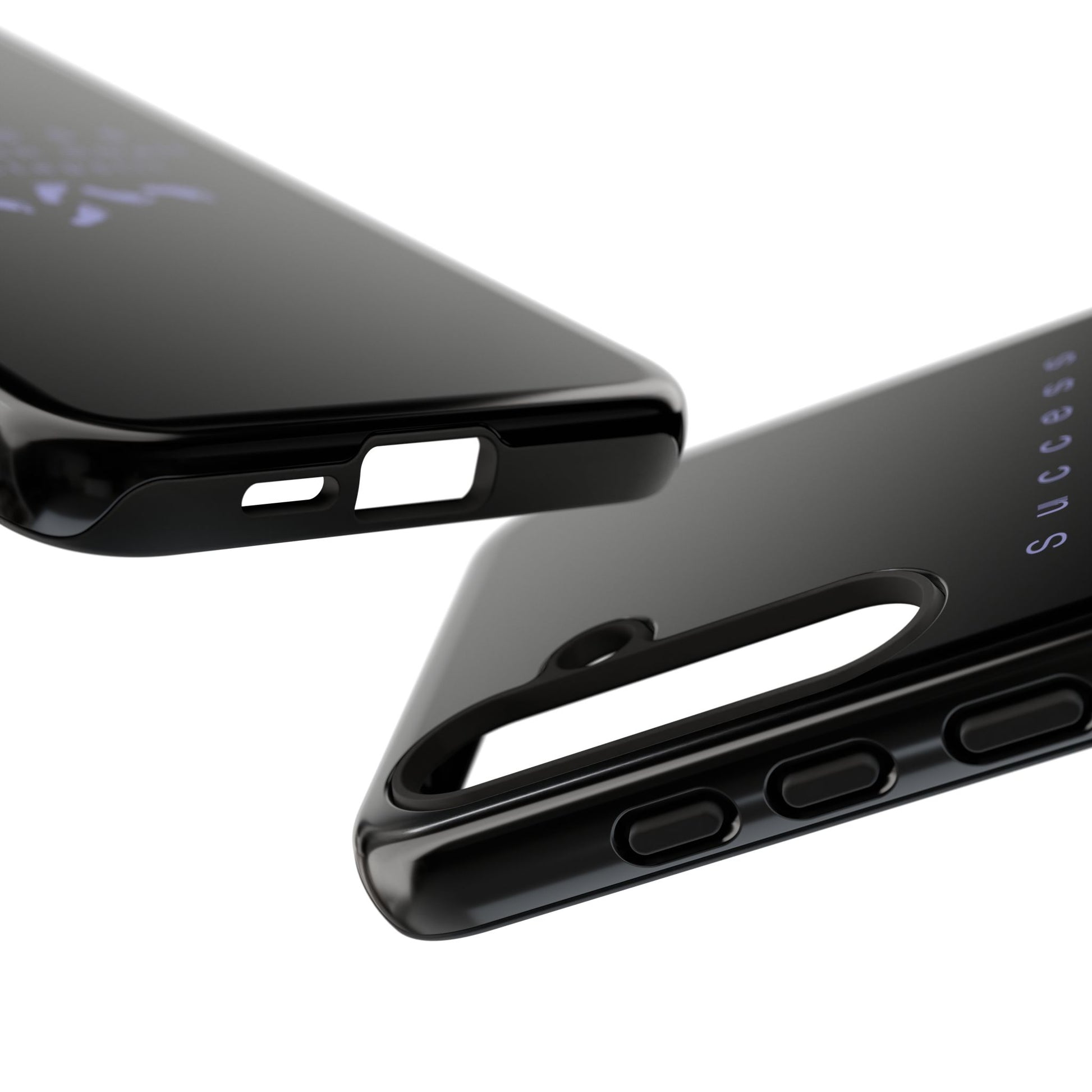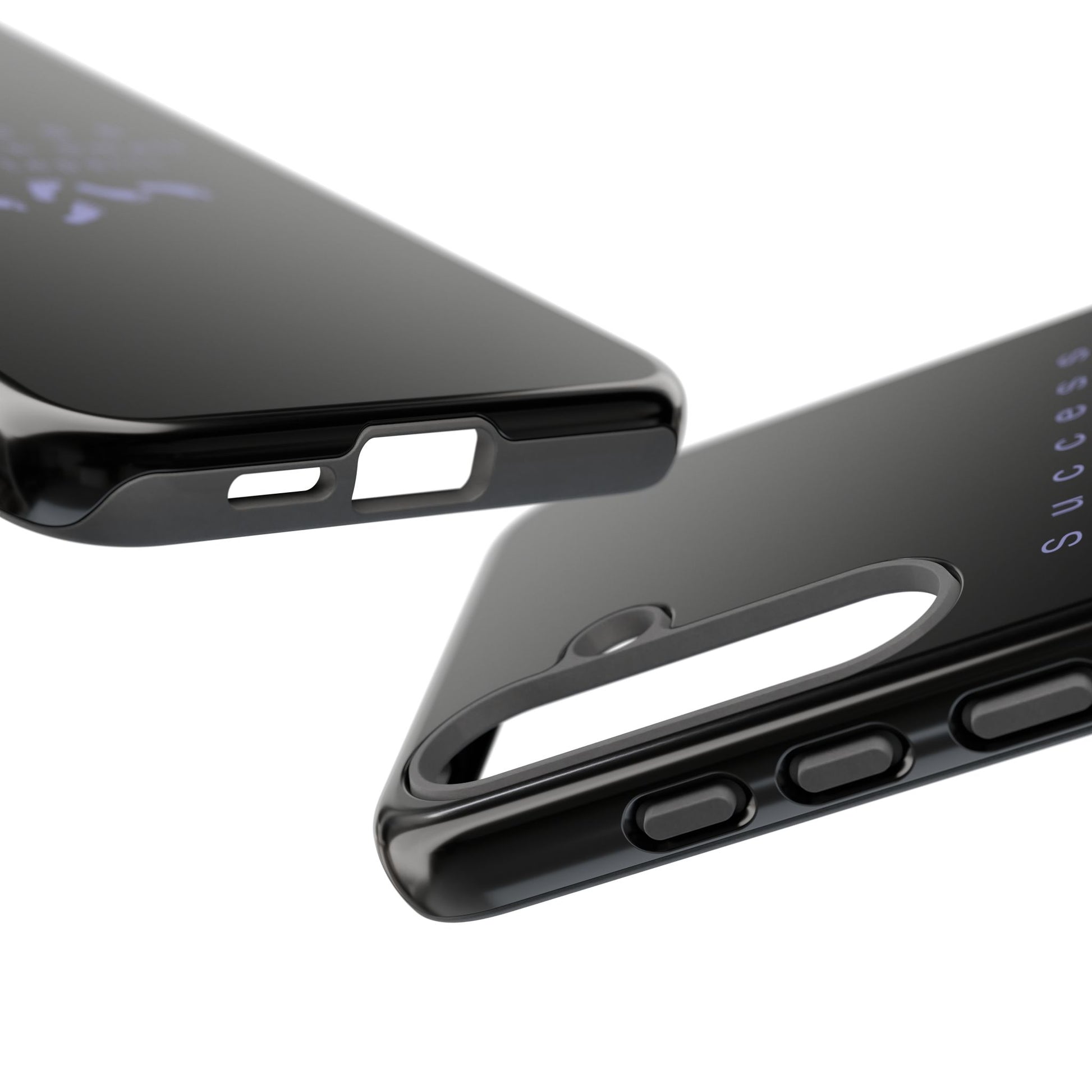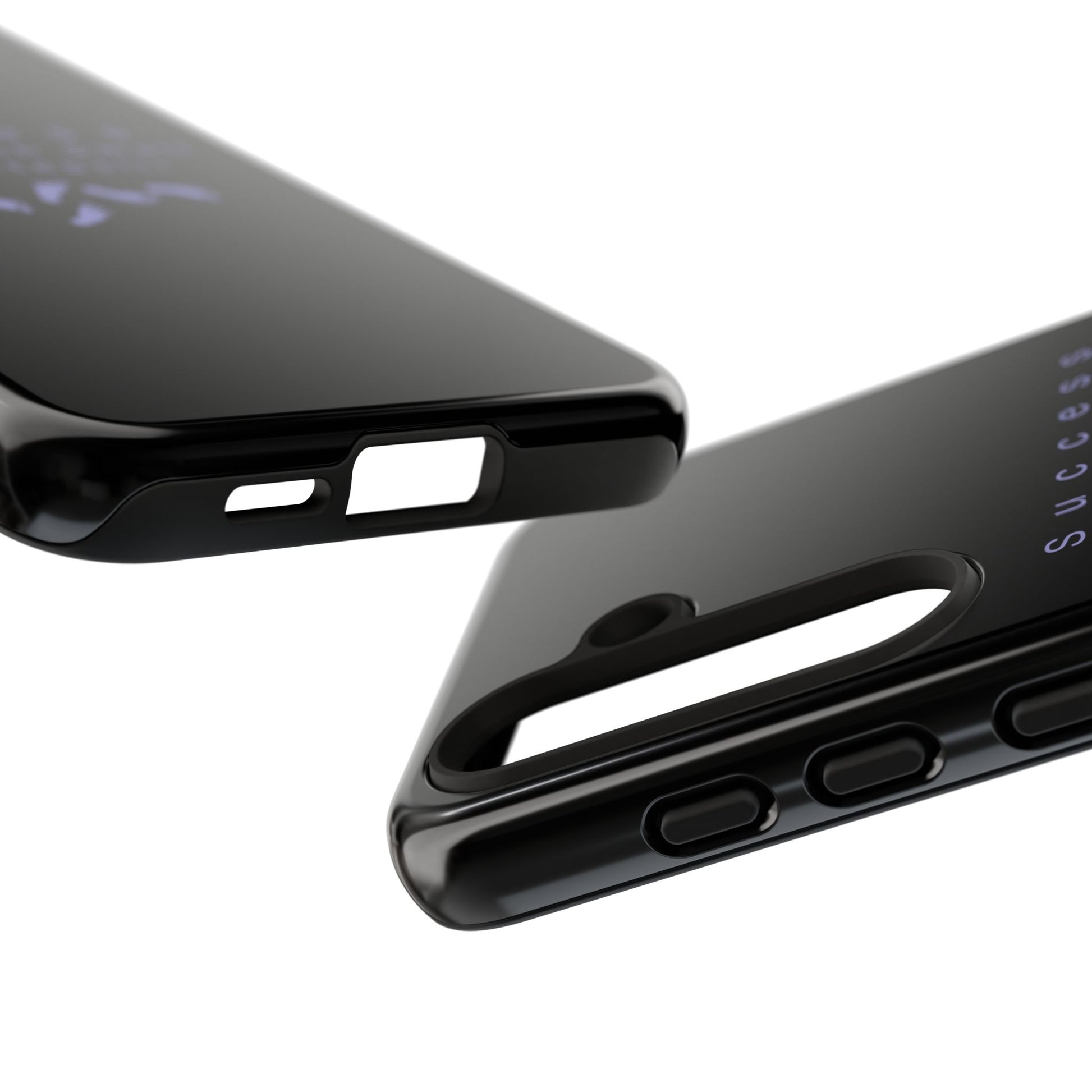 A slim, dual-layer protective phone case with a quiet, motivational design: pale lilac text reading “Success Starts With Small Baby Steps!!!” above a trail of tiny shoe prints on a deep matte black background. The case feels sturdy in hand thanks to a TPU silicone liner that cushions drops, while the hard polycarbonate shell resists impacts and maintains the printed artwork with full 3D wrap transfer. It slips into pockets without bulk and keeps ports clear for charging and headphones, while still supporting standard wireless charging. Lightweight, rugged, and understated — this case is for someone who moves forward deliberately and wants their everyday gear to reflect that steady mindset.
